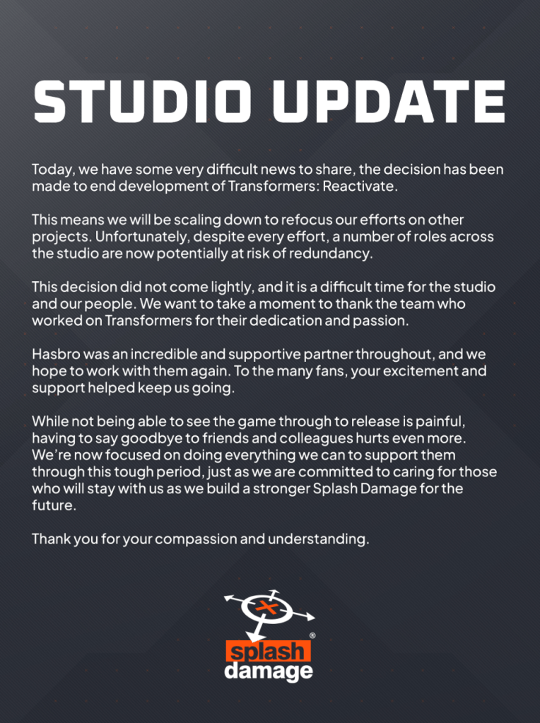 Transformers: Reactivate the 4 player online action game, developed by Splash Damage has been unfortunately cancelled the announcement was made over on X (Twitter)