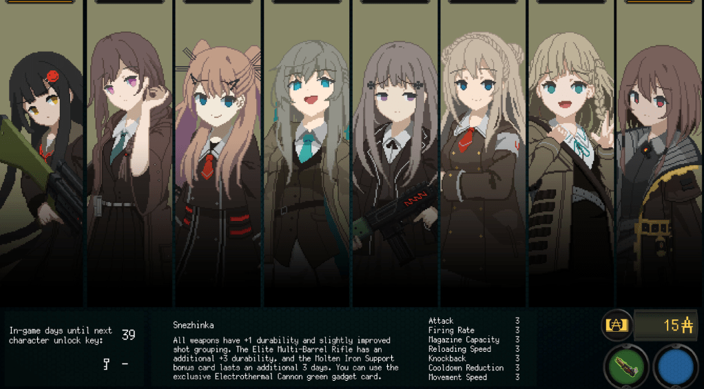 Play as Snezhinka, a fixed-term contract employee at a private military company, and hold the line against waves of hostile mechs in a 2.5D dystopian world. In order to survive against increasingly powerful enemies, you’ll need to use what remains of your meager salary after taxes and other expenses are deducted to purchase cards and develop your combat capabilities.