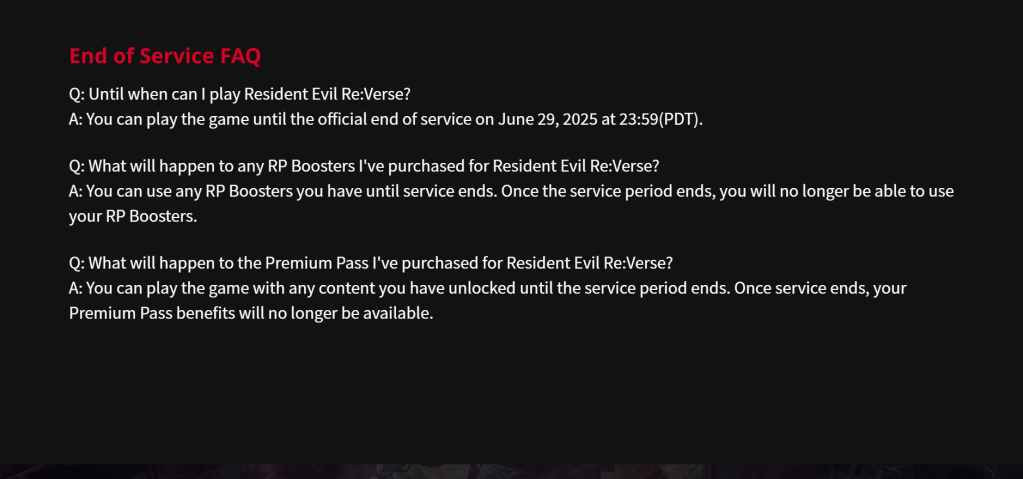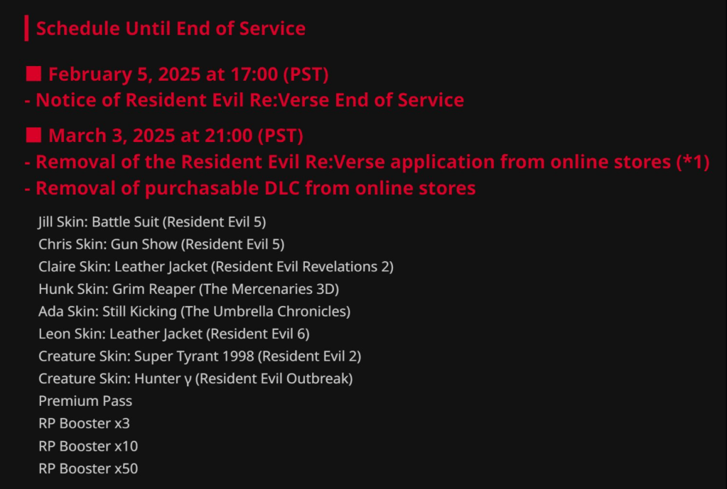 This is to inform you that service will be ending for Resident Evil Re:Verse, which comes packaged with a purchase of Resident Evil Village for PlayStation®5, PlayStation®4, Xbox Series X|S, Xbox One, or Steam. The application and all of its related DLC will no longer be available for download or purchase.