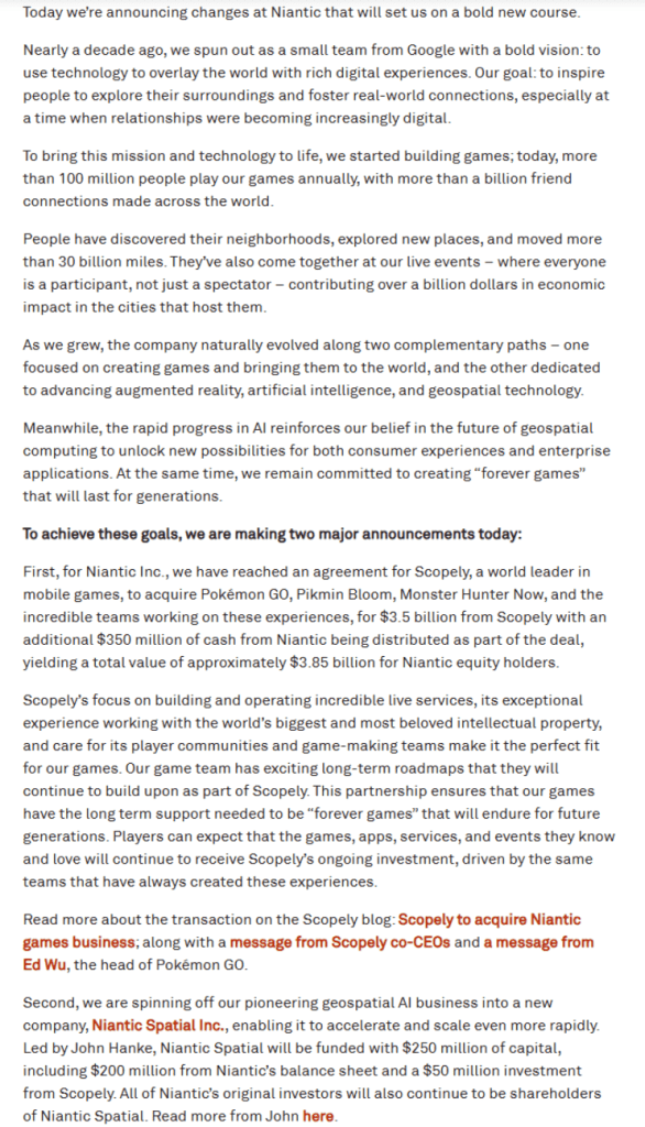Niantic, the developer behind Pokémon Go, has agreed to sell its entire gaming division to Saudi-owned Scopely for $3.5 billion. This strategic move allows Niantic to focus on geospatial technology, spinning off its geospatial AI business into a new firm called Niantic Spatial, led by CEO John Hanke.