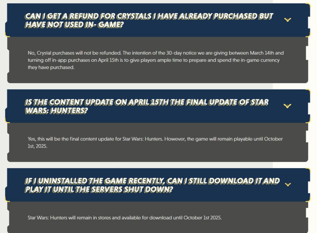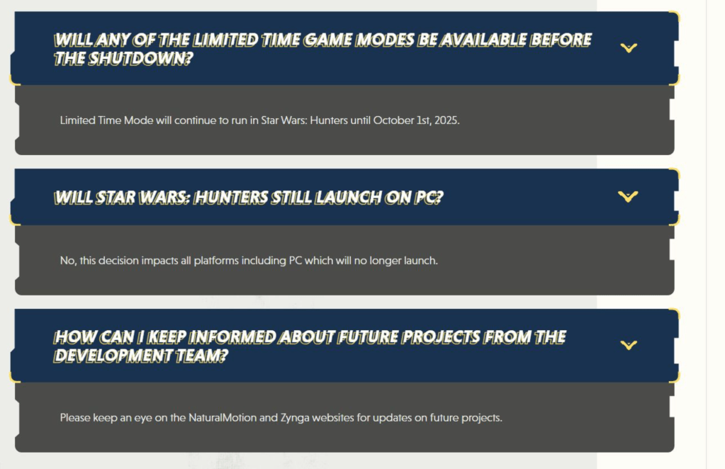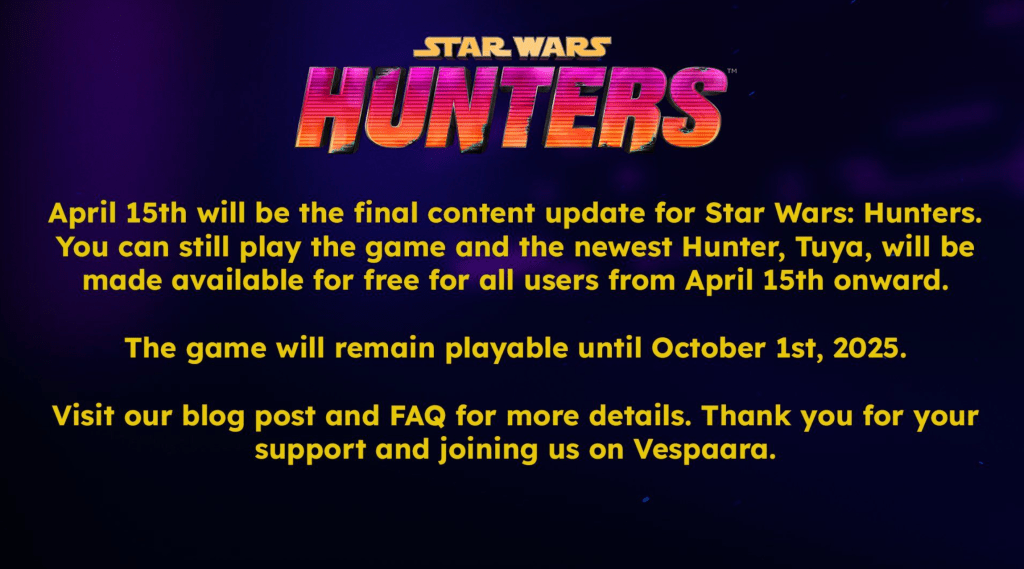 Zynga has announced that Star Wars: Hunters, the free-to-play arena shooter, will be taken offline on October 1, 2025. The game’s final content update is scheduled for April 15, 2025, introducing a new Support Hunter named Tuya, who will be available to all players at no cost. Additionally, Season 5 will be extended by three weeks, with events, shop bundles, and ranked leaderboards remaining active until the servers shut down.
