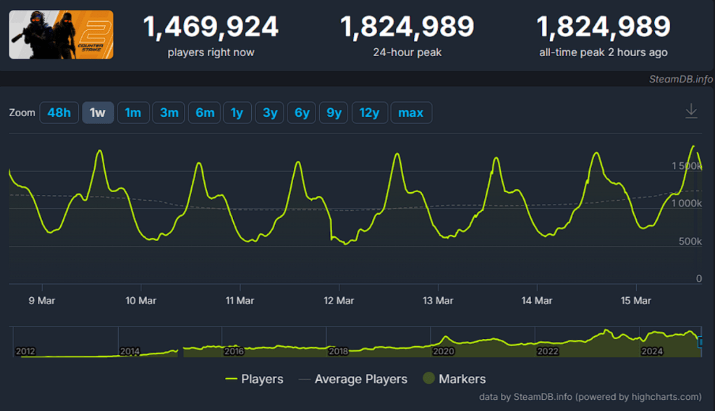 Counter-Strike 2 has once again set a new record for concurrent players, reaching an all-time peak of 1,824,989 on March 15, 2025.