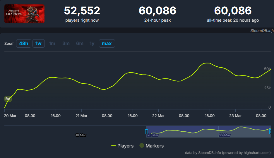 Ubisoft’s latest release, Assassin’s Creed Shadows, has achieved remarkable success since its launch on March 20, 2025. The game surpassed 1 million players on its first day and 2 million within two days, outperforming the launch numbers of previous titles in the series, such as Assassin’s Creed Origins and Assassin’s Creed Odyssey.