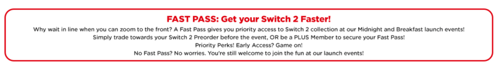 The catch is though, you need a ticket, and to get a ticket you either need to be an EB World Plus member or trade your Switch 1 console in next week. It’s not clear why the limitation is in place, but best guess is either they don’t want the midnight launches getting too out of hand, or they want to sign more members up to EB World Plus as it does cost $49 annually.