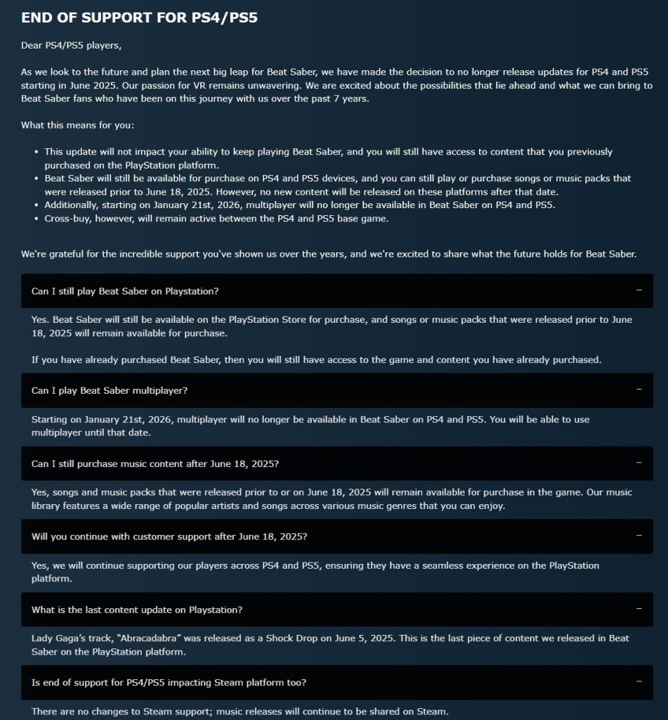 Although future updates are ending, players on PS4 and PS5 can still purchase and enjoy Beat Saber and all existing DLC. Cross-buy remains intact, meaning users who bought the game on PS4 can still play it on PS5 with supported VR hardware.