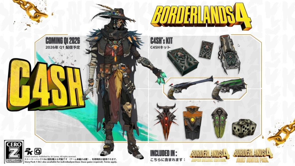 Unlike the four launch Vault Hunters, who were built into the main campaign, C4SH will be introduced through the DLC as a fully playable fifth character. His design leans into Borderlands’ trademark mix of dark humor and chaotic mechanics: C4SH is a former casino dealer-bot repurposed for combat, built around a theme of risk and reward.