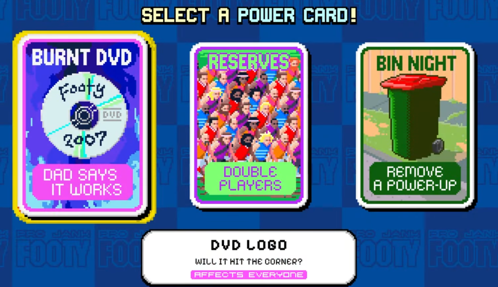 Across four quarters, you will do whatever you possibly can, to beat the other team, from picking a team inspired by the Bunnings Sausage Sizzle or after conceding a goal, picking a power up that will shake the game apart, sometimes literally.