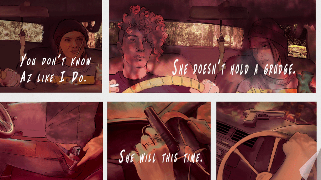 Visually, Ashes presents itself as a hand-crafted interactive graphic novel, using stark, gritty artwork to capture the mood of regional Victoria. The panel-based presentation emphasizes isolation and unease, reinforcing the sense that Azar is never truly safe even in places meant to offer shelter.