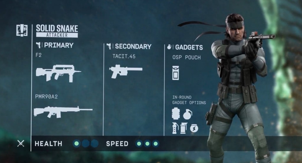Stat-wise, he slots in as a one-health, three-speed Operator fragile, but fast. It’s exactly what you’d expect from one of gaming’s most legendary stealth specialists.