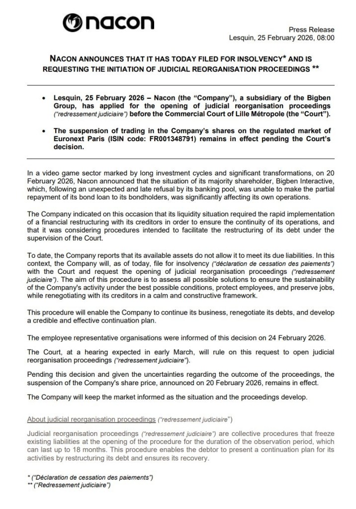 By entering this process, Nacon is attempting to safeguard its workforce and maintain business continuity while it works through its financial obligations.