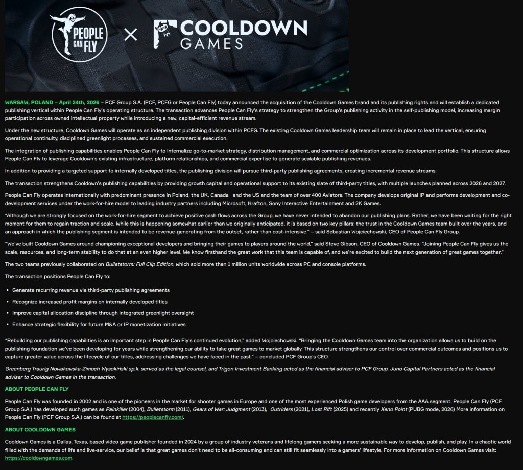 Cooldown Games a publishing-focused outfit will now operate under the People Can Fly umbrella, with its existing publishing rights transferring over as part of the acquisition.